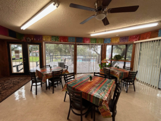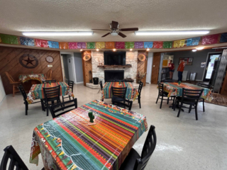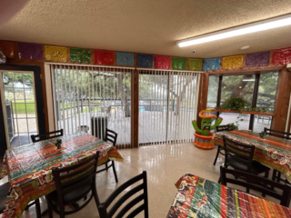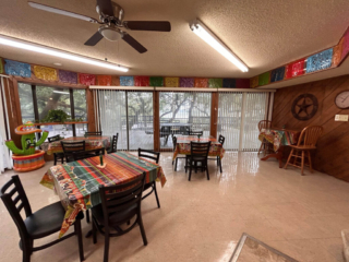 This is where you will register when you arrive. We stock a few common grocery and RV items for your convenience. There is a five-table dining room with a fireplace and large TV to catch a game or a movie. The seating area has direct access to our shaded multi-level outdoor deck and shares the building with the other clubhouse amenities.